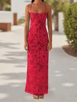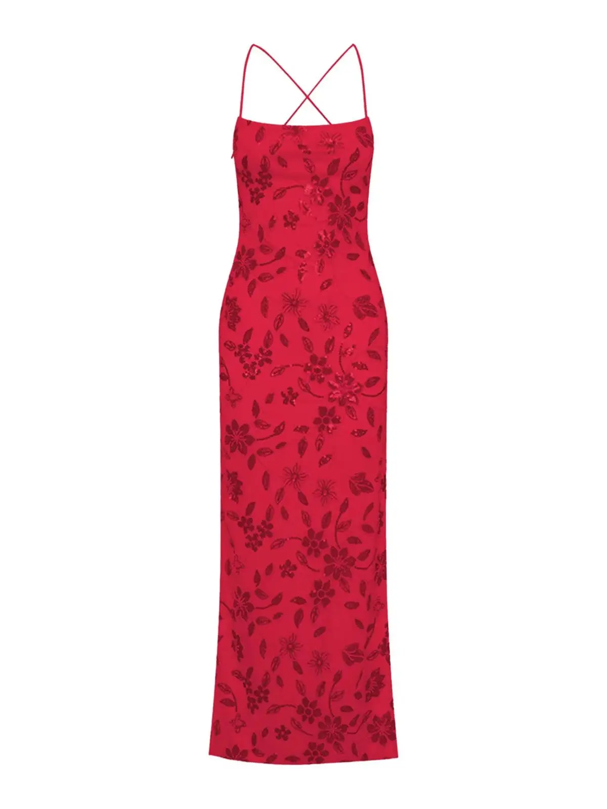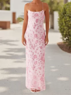 Women Beaded Flower Cami Dress Glitter Sequin Spaghetti Strap Open Back High Split Long Dress for Party Club