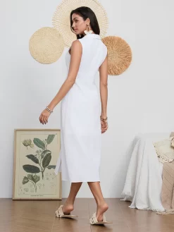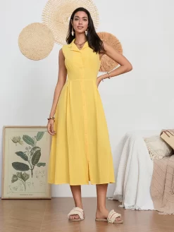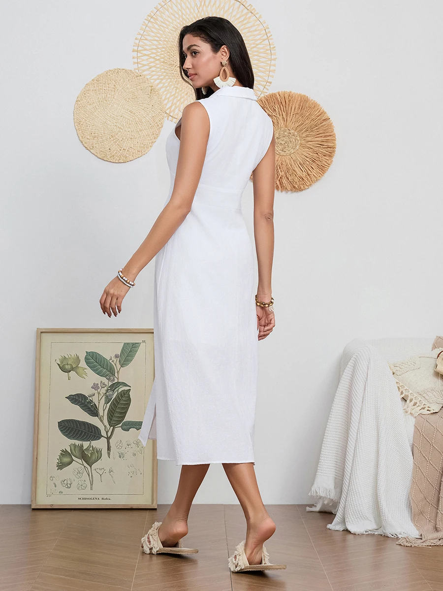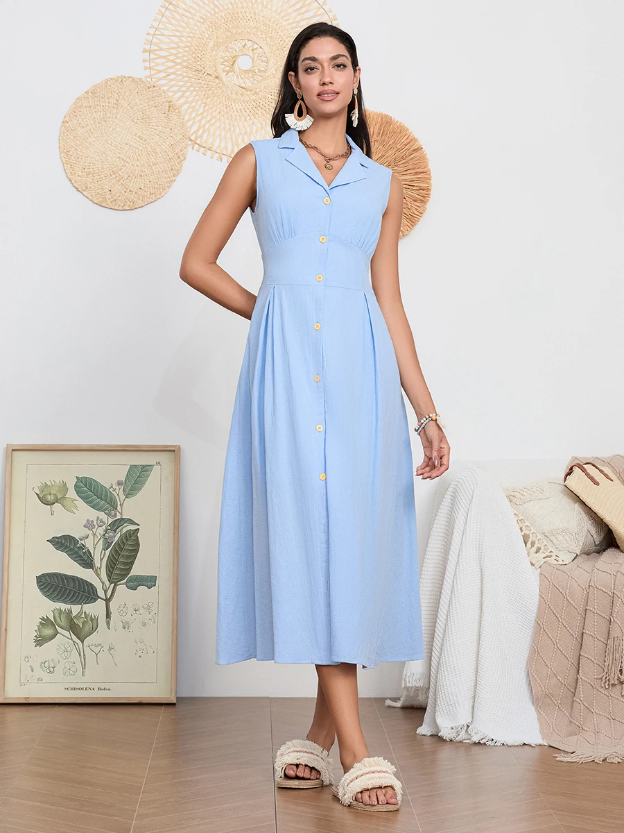 Women Long Dress Sleeveless Turn-down Collar Button-down Slim Waist A-line Tank Dress Party Casual Summer Sundress Streetwear