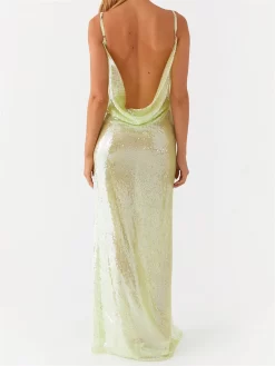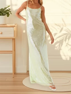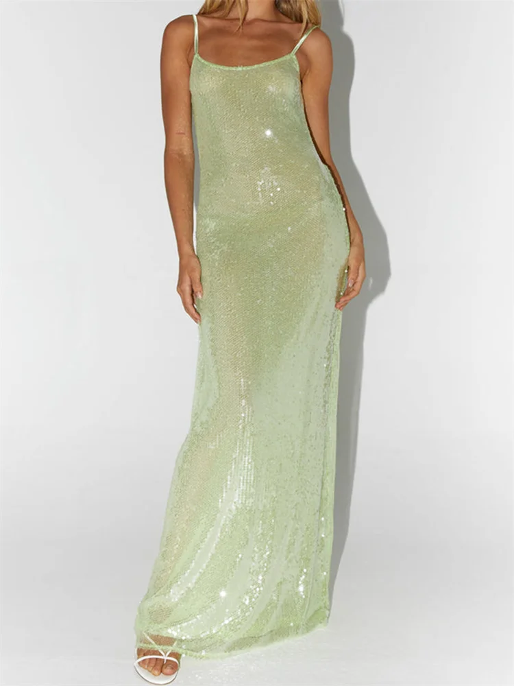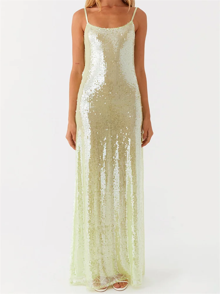 Shiny sequins, sleeveless, adjustable spaghetti straps, draped back and backless; Summer dresses for women; Beach dresses for women, ankle length design, make your legs longer and slimmer