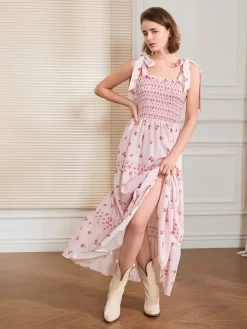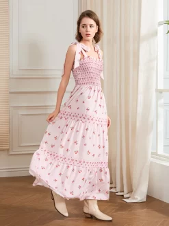 Women Slip Dress, Sleeveless Tie-up Floral Dress Summer Long Swing Dress for Daily Party